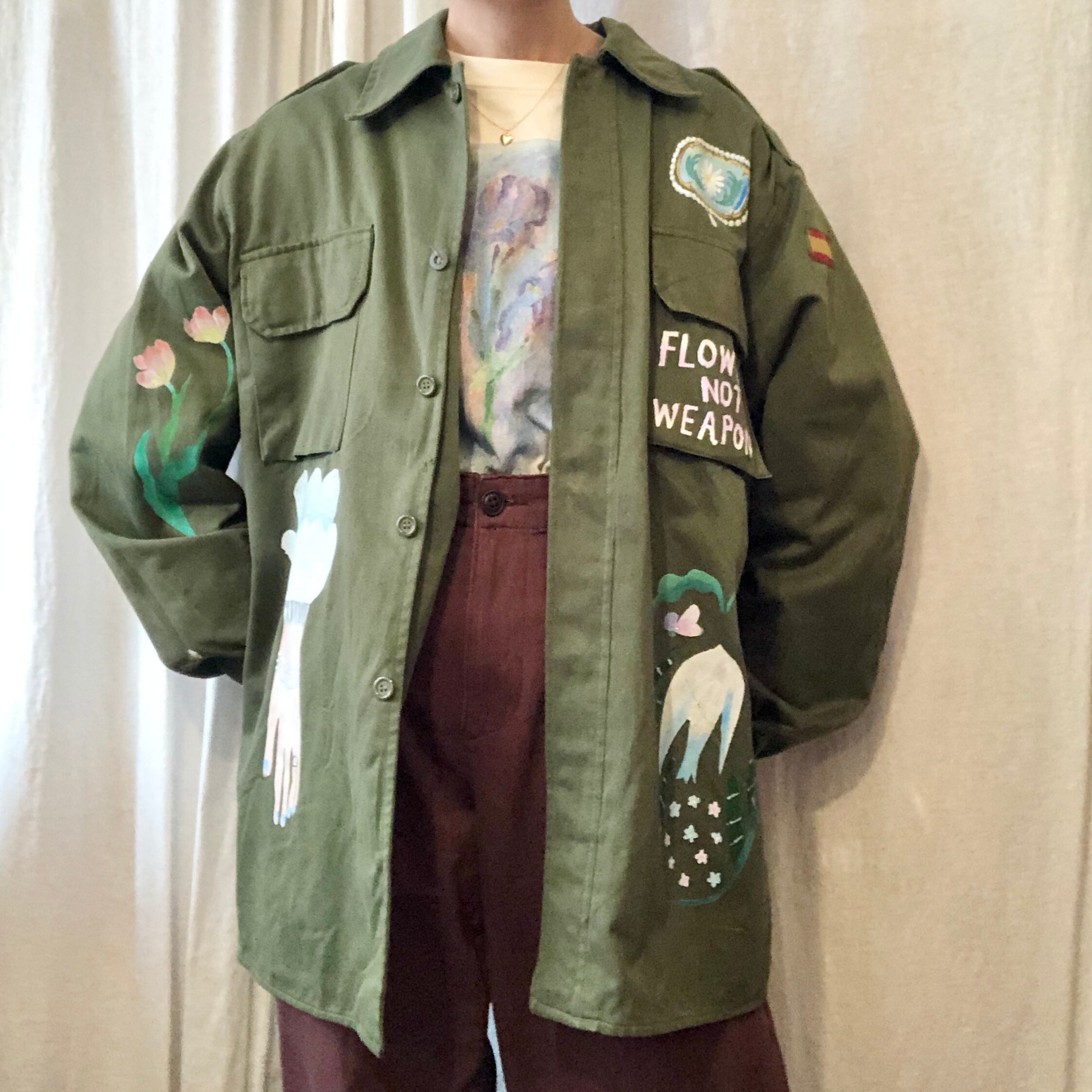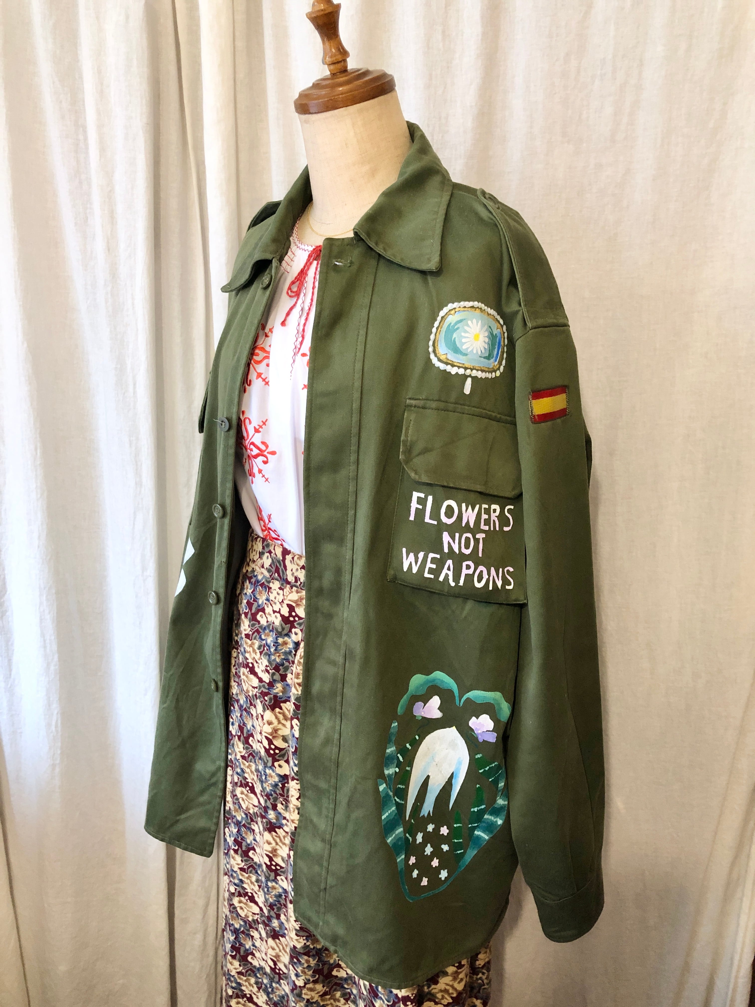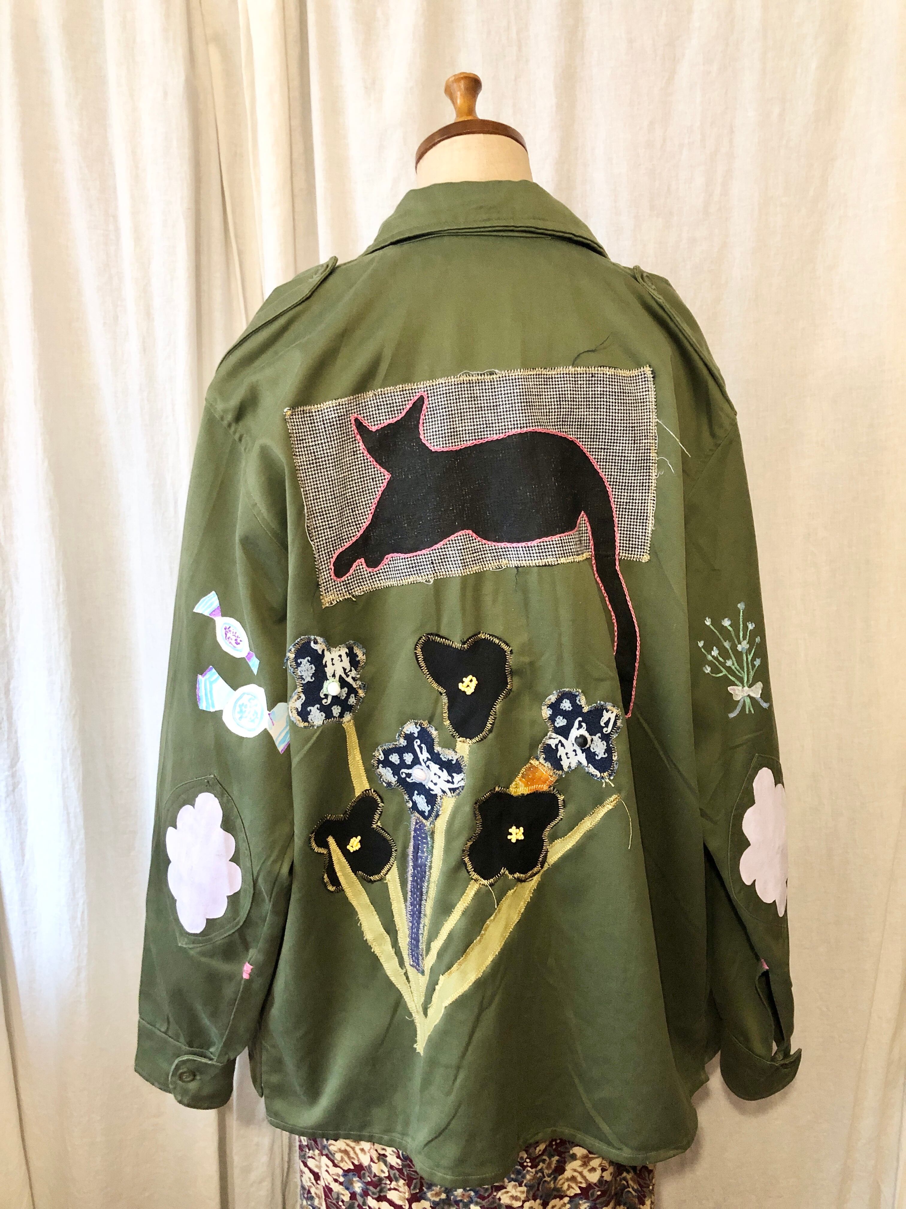 80年代のスペイン軍シャツジャケットにハンドペイントとパッチワークを施して制作された一着。後ろ姿も可愛いです♡